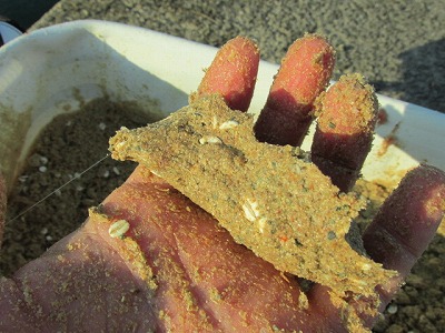 片手に配合ヌカを掴み、握ってみて、軽く固まれば完了です。